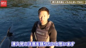 さらにイルカと一緒に泳げる「つくみイルカ島」では、石川市長が「プッシング」という技に挑戦しながら、今後の津久見への決意を叫ぶ!?