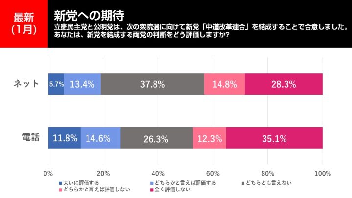 「立憲民主党と公明党は、次の衆院選に向けて新党『中道改革連合』を結成することで合意しました。あなたは、新党を結成する両党の判断をどう評価しますか」と聞いた結果が上の図です。