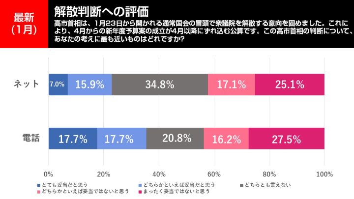 今回の調査は高市総理による解散の正式表明(19日)の前でしたが、電話調査とネット調査ともに「妥当ではない(まったく妥当ではない、どちらかといえば妥当ではない)」が約4割で、「妥当(とても妥当だと思う、どちらかといえば妥当だと思う)」を上回りました。