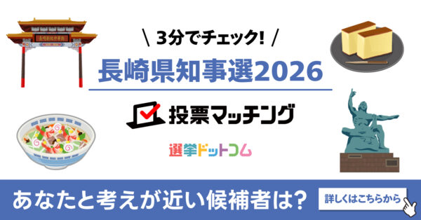 「長崎県知事選挙2026投票マッチング」では、1月22日告示・2月8日投開票の長崎県知事選の投票先を選ぶ目的で、私たちの生活に直結する政策に関する質問への賛否を回答していくとあなたの考えに近い候補者とのマッチング度が測定できるサービスです。