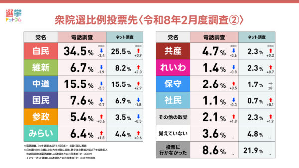 2月8日投開票の衆院選よりも前に実施した2月2日~4日の意識調査の結果から、各党に変動が見られました。